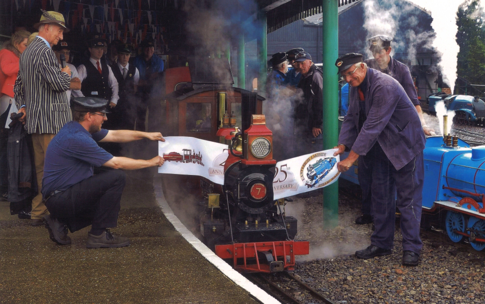 The ELMR celebrates its 25th Anniversary in 2017 with original locomotive 'Sandy River' being driven through a banner by founder Clive Upton.